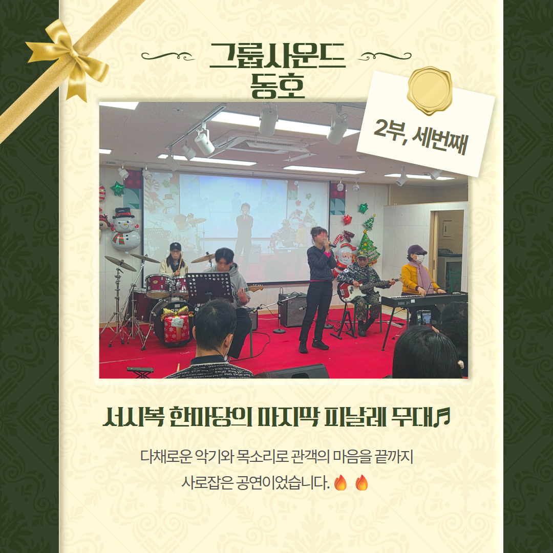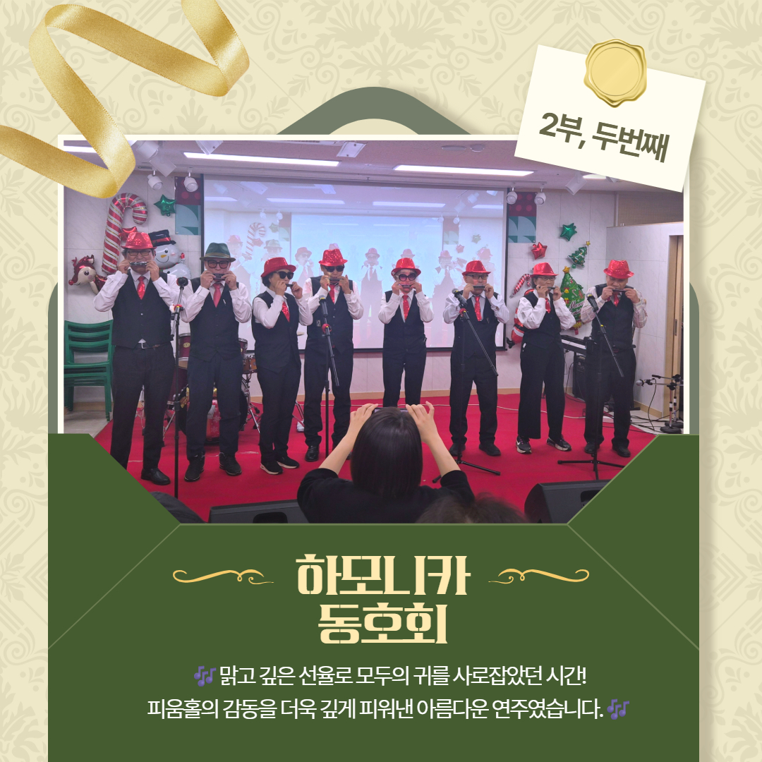 참여자들은 사물놀이, 드럼, 하모니카, 우쿨렐레, 밴드 등 다채로운 악기 연주부터 열정이 가득한 노래 공연까지 선보이며 큰 박수와 응원을 받았습니다.