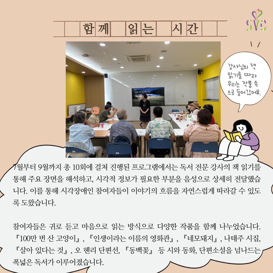 7월부터 9월까지 총 10회에 걸쳐 진행된 프로그램에서는 독서 전문 강사의 책 읽기를 통해 주요 장면을 해석하고, 시각적 정보가 필요한 부분을 음성으로 상세히 전달했습니다. 이를 통해 시각장애인 참여자들이 이야기의 흐름을 자연스럽게 따라갈 수 있도록 도왔습니다.