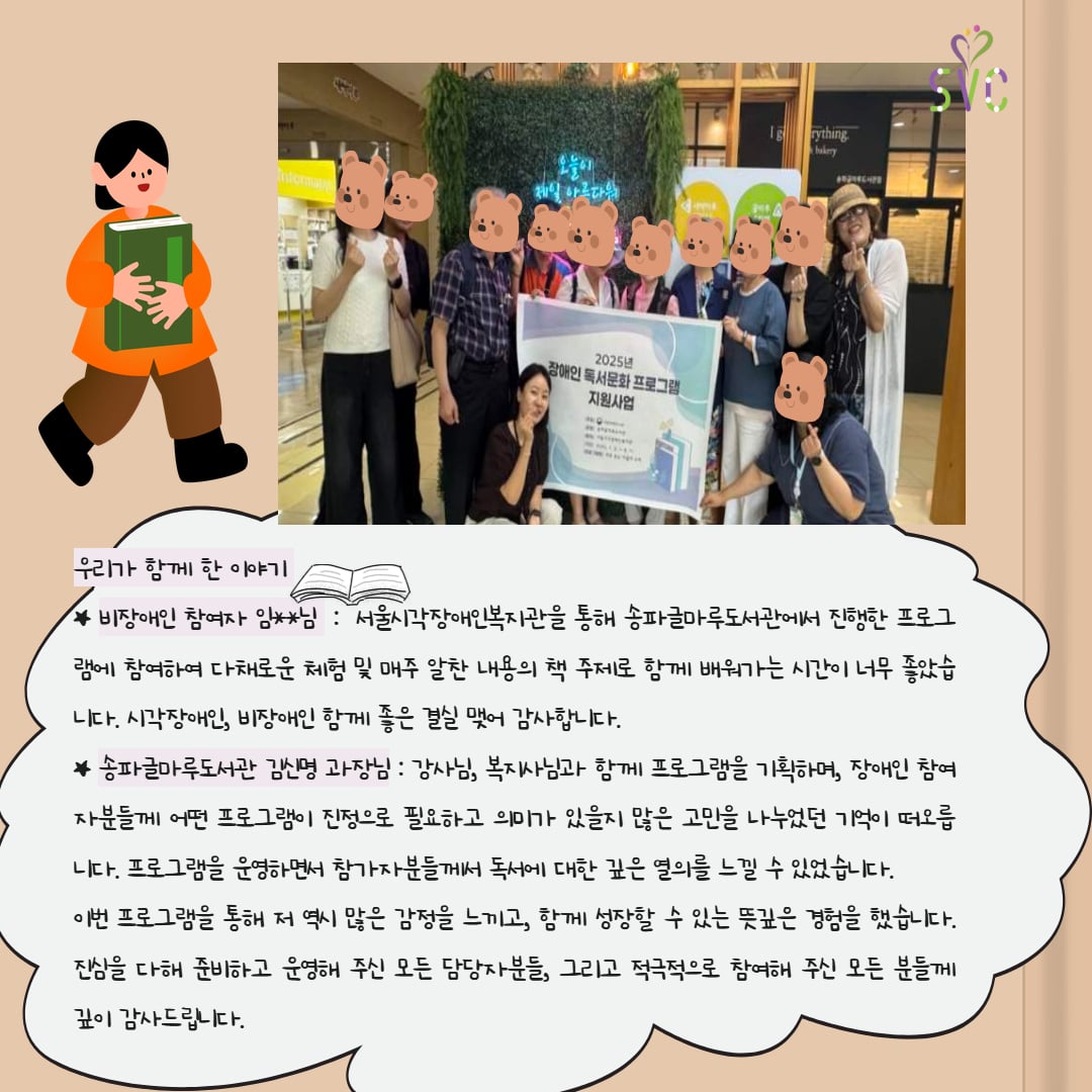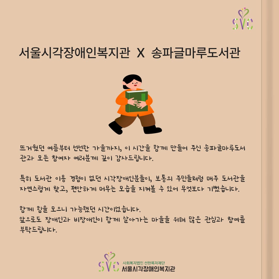서울시각장애인복지관과 송파글마루도서관은 7월부터 9월까지 2025 장애인 독서 문화 프로그램 '귀로 듣는 마음의 소리'를 운영했습니다.