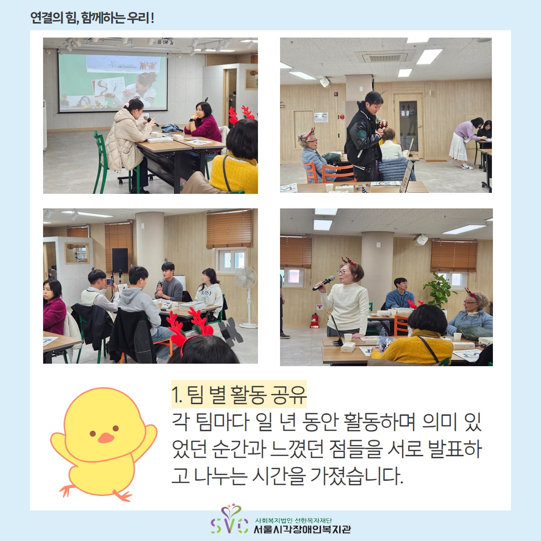 각 팀마다 일 년 동안 활동하며 의미 있었던 순간과 느꼈던 점들을 서로 발표하고 나누는 시간을 가졌습니다.