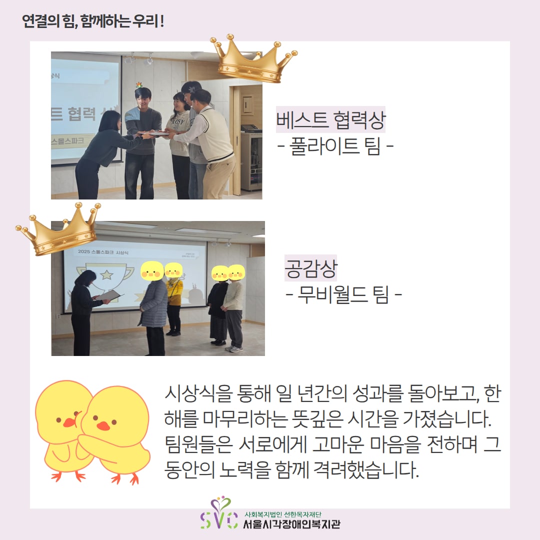 시상식을 통해 일 년간의 성과를 돌아보고, 한 해를 마무리하는 뜻깊은 시간을 가졌습니다. 팀원들은 서로에게 고마운 마음을 전하며 그동안의 노력을 함께 격려했습니다.