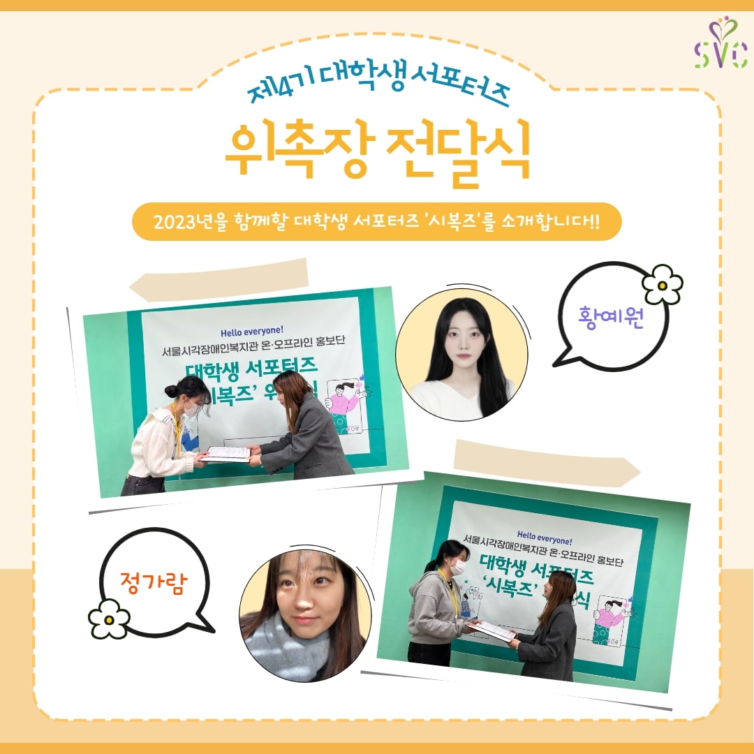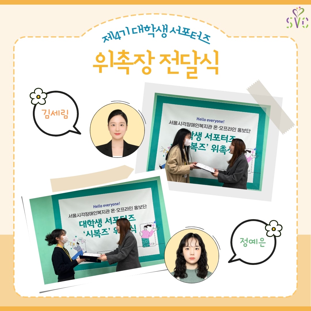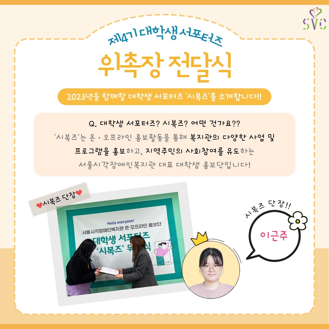 지역주민의 사회참여를 유도하는 서울시각장애인복지관 대표 대학생 홍보단입니다!