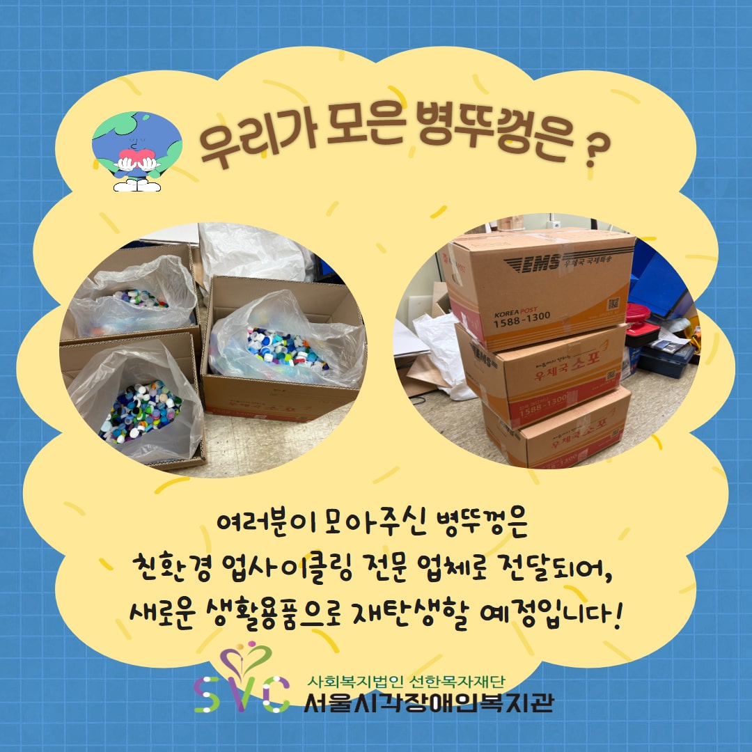 모아진 병뚜껑은 친환경 업사이클링 전문 업체로 보내져, 앞으로 새로운 생활용품으로 다시 태어나게 될 예정입니다.