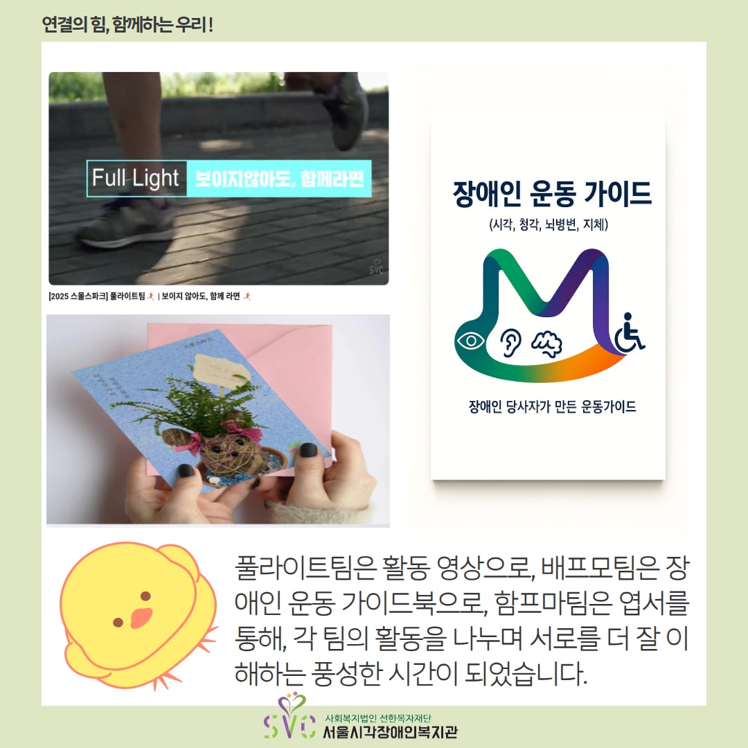 풀라이트팀은 활동 영상으로, 배프모팀은 장애인 운동 가이드북으로, 함프마팀은 엽서를 통해, 각 팀의 활동을 나누며 서로를 더 잘 이해하는 풍성한 시간이 되었습니다.