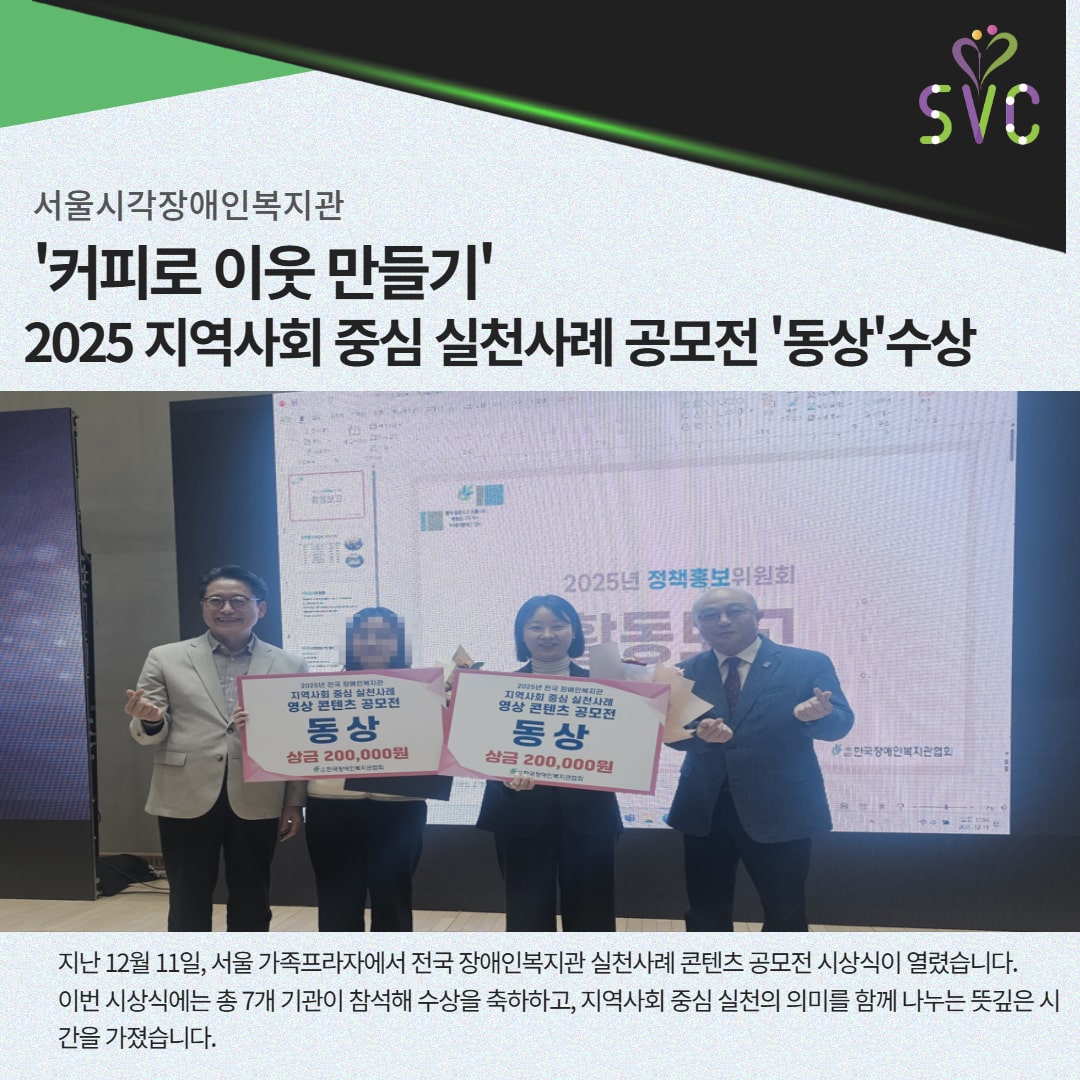 서울시각장애인복지관은 한국장애인복지관협회과 주관한 전국 장애인복지관 지역사회 중심 실천사례 콘텐츠 공모전에서 '동상'을 수상했습니다.
