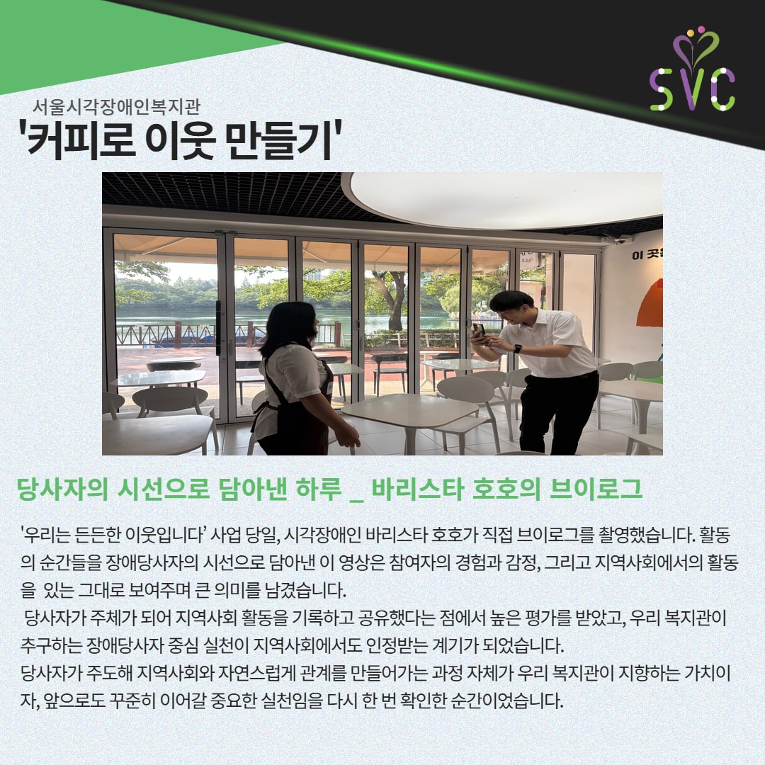 '우리는 든든한 이웃입니다’ 사업 당일, 시각장애인 바리스타 호호가 직접 브이로그를 촬영했습니다. 활동의 순간들을 장애당사자의 시선으로 담아낸 이 영상은 참여자의 경험과 감정, 그리고 지역사회에서의 활동을 있는 그대로 보여주며 큰 의미를 남겼습니다.