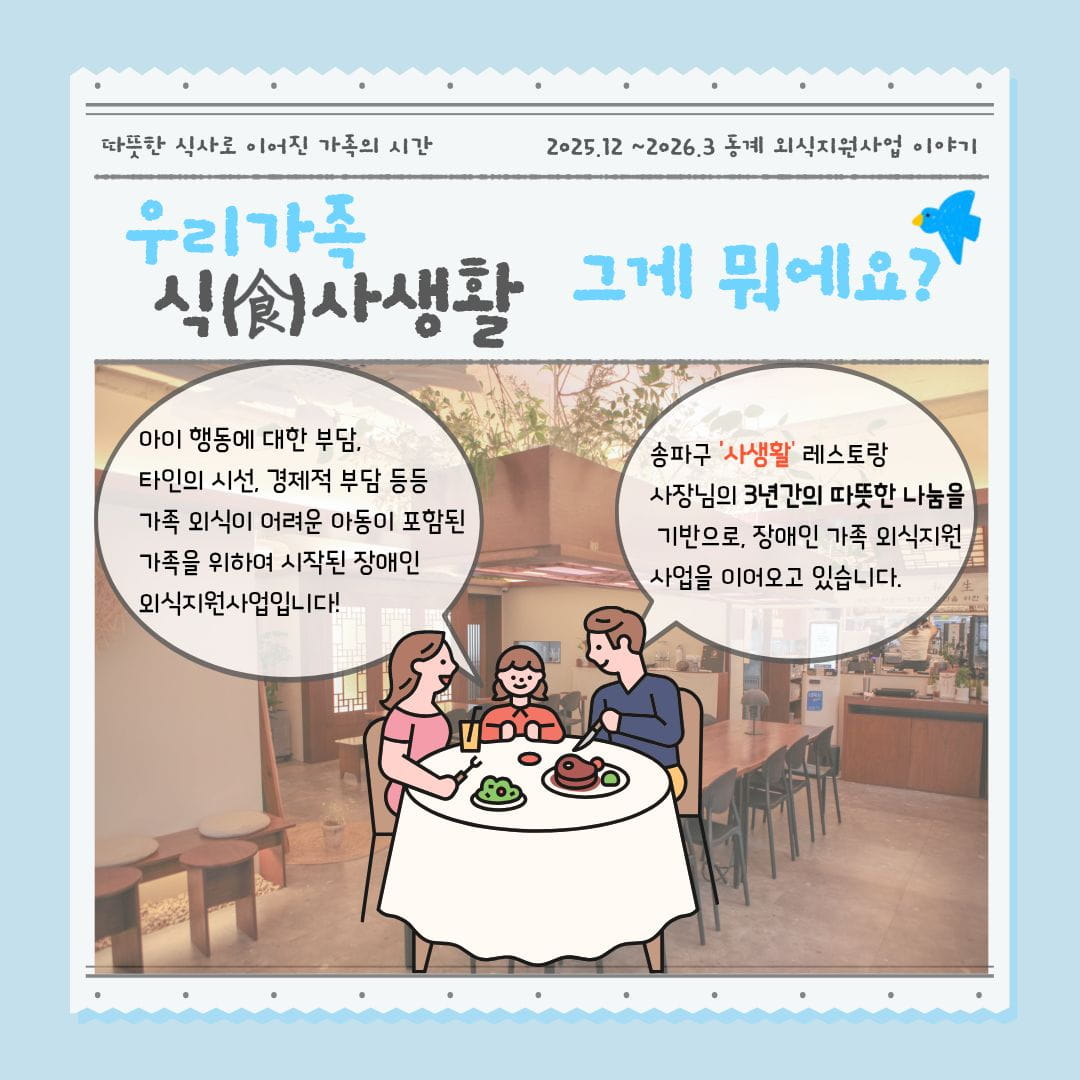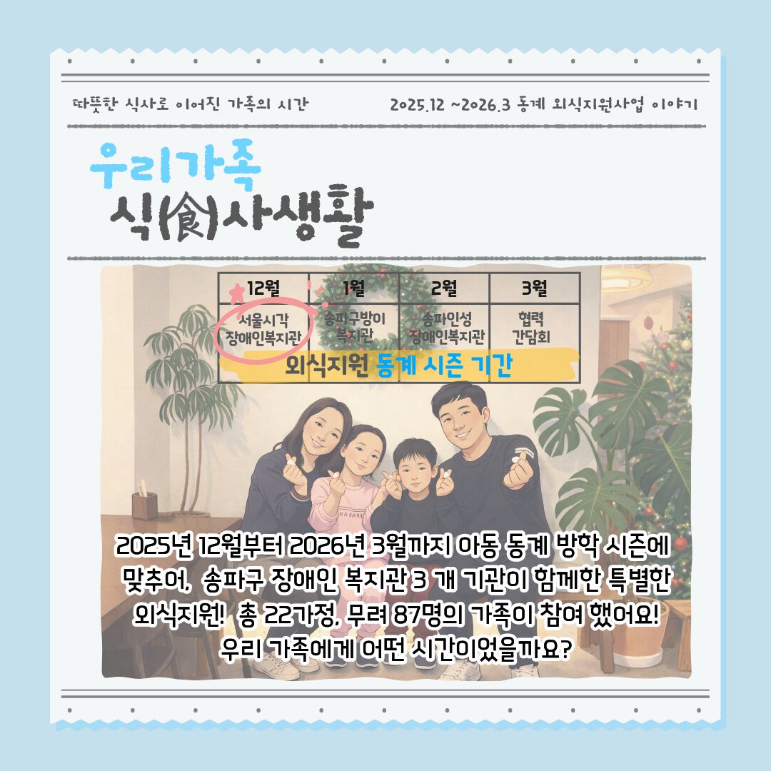 2025년 12월부터 2026년 3월까지, 아동 동계 방학 시즌에 맞추어 송파구 장애인복지관 3개 기관이 함께한 특별한 외식지원이 진행되었습니다.