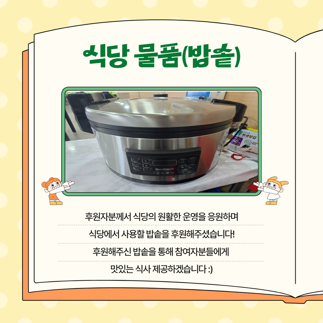 - 무기명 후원자 : 후원자분께서 복지관 식당의 원활한 운영을 응원하며 식당에서 사용할 밥솥을 후원해주셨습니다. 후원해주신 밥솥을 통해 참여자분들에게 맛있는 식사를 제공할 예정입니다
