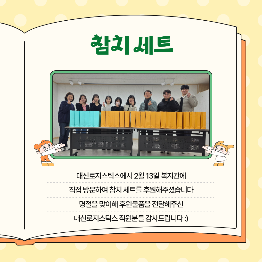 - 대신로지스틱스 : 2월 13일 복지관에 직접 방문하여 참치 세트를 후원해주셨습니다. 명절을 맞이해 후원물품을 전달해주신 대신로지스틱스 직원분들 감사드립니다.