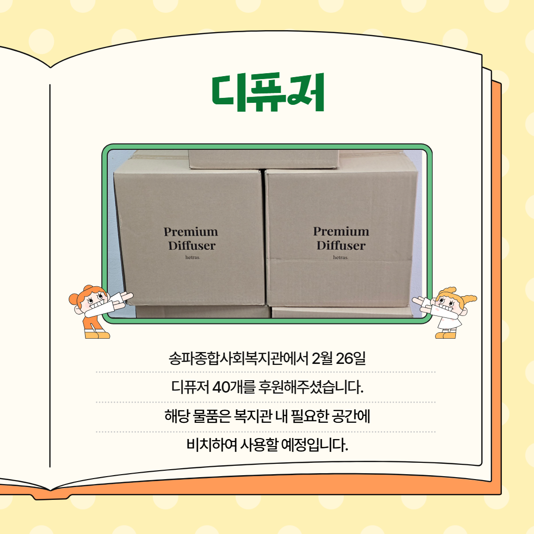 - 송파종합사회복지관 : 2월 26일 디퓨저 40개를 후원해주셨습니다. 해당 물품은 복지관 내 필요한 공간에 비치하여 사용할 예정입니다.