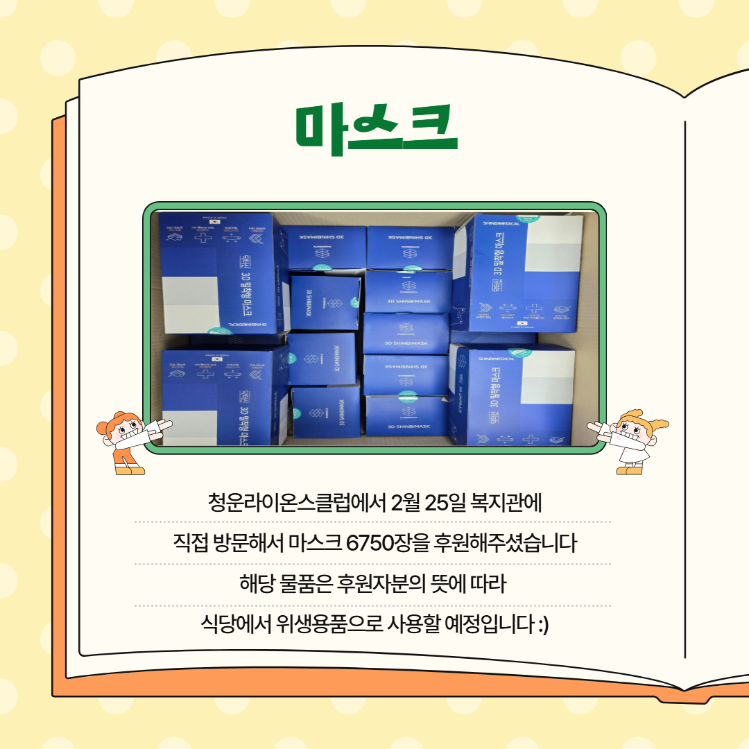- 청운라이온스클럽 : 2월 25일 복지관에 직접 방문하여 마스크 6750장을 후원해주셨습니다. 해당 물품은 후원자분의 뜻에 따라 식당에서 위생용품으로 사용할 예정입니다.