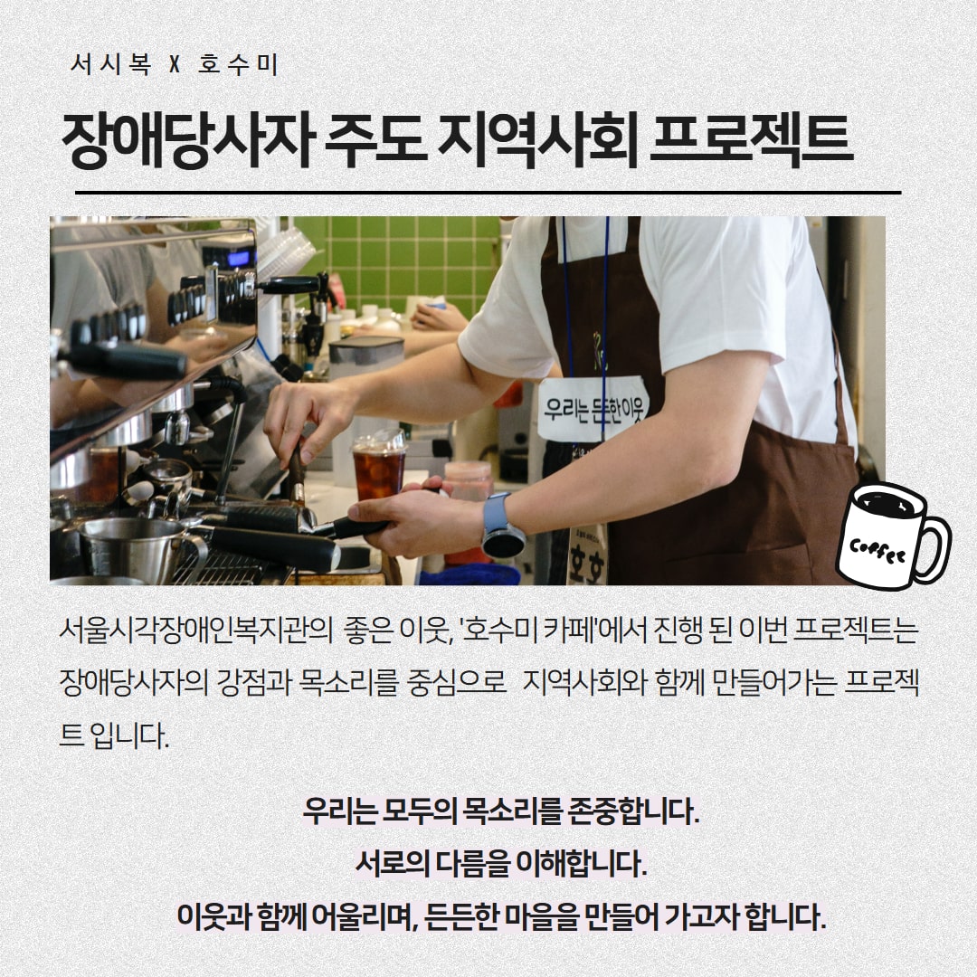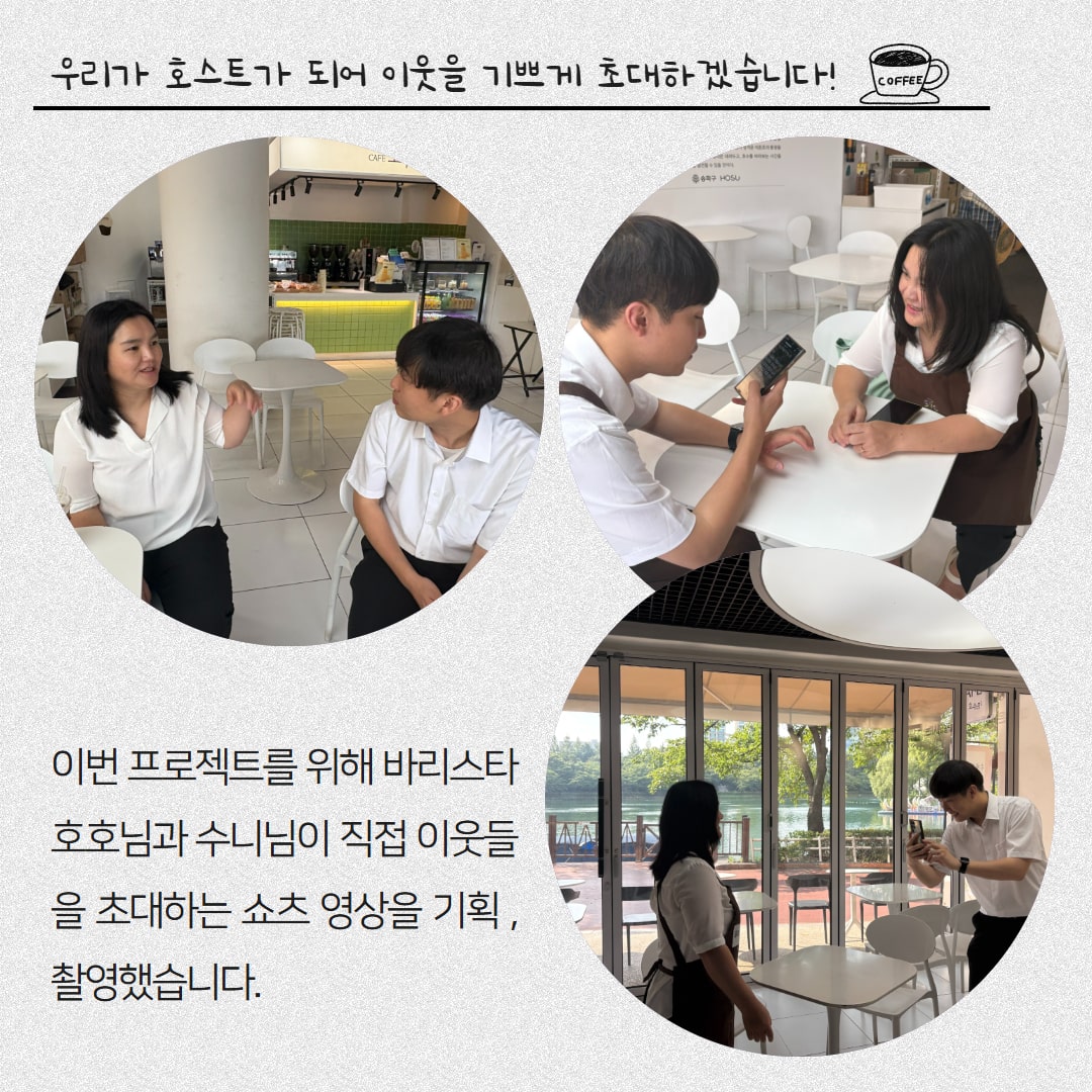 이번 활동에서는 시각장애인 바리스타 호호님과 수니님이 직접 호스트가 되어 이웃님들을 초대하는 쇼츠 영상을 기획하고 촬영했습니다