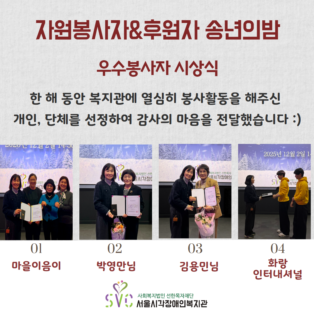 서울시각장애인복지관에서는 지난 12월 2일, 자원봉사자&후원자분들을 모시고 송년의밤 행사를 진행했습니다.