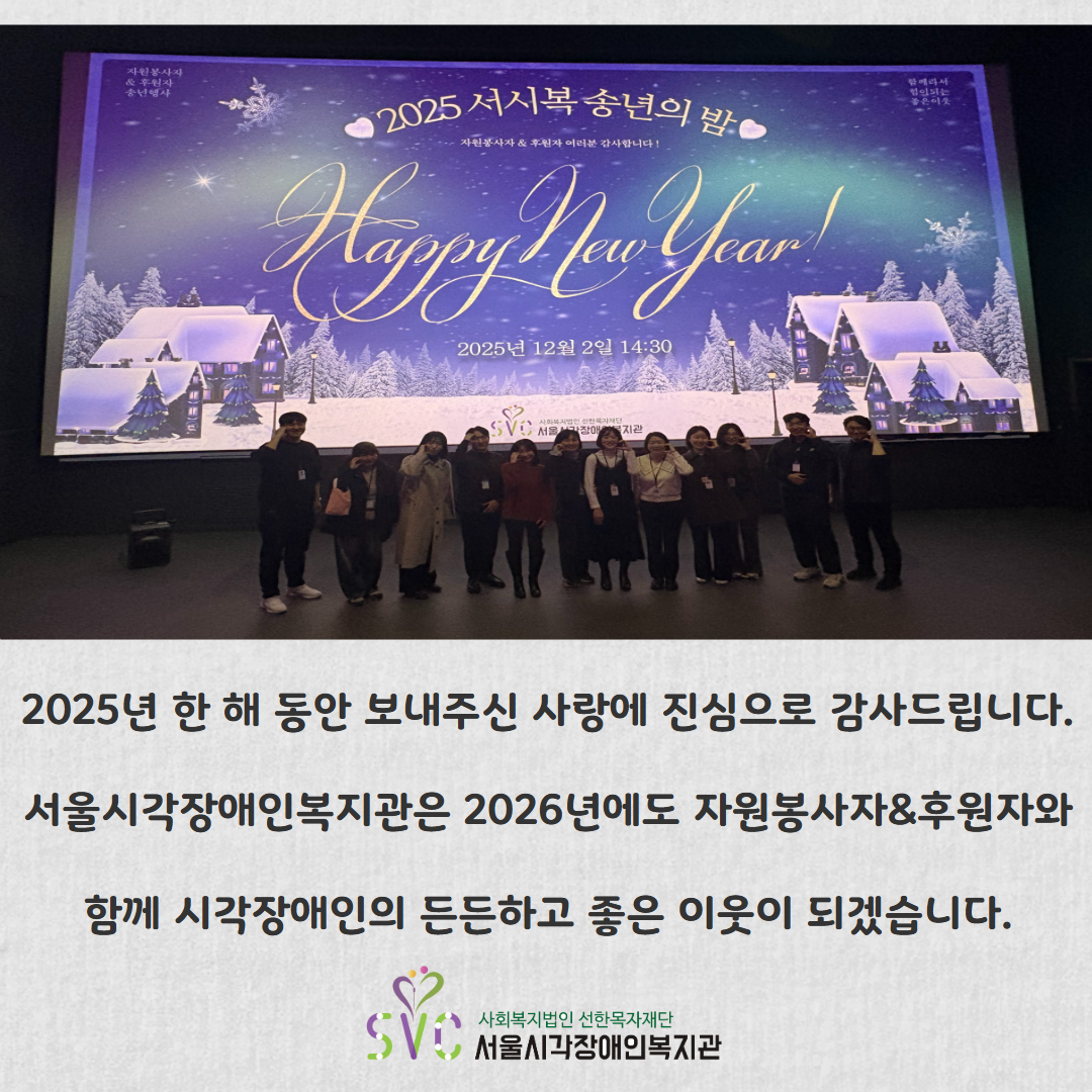서울시각장애인복지관은 2026년에도 자원봉사자&후원자분들과 함께 시각장애인의 든든한, 좋은 이웃이 되겠습니다.