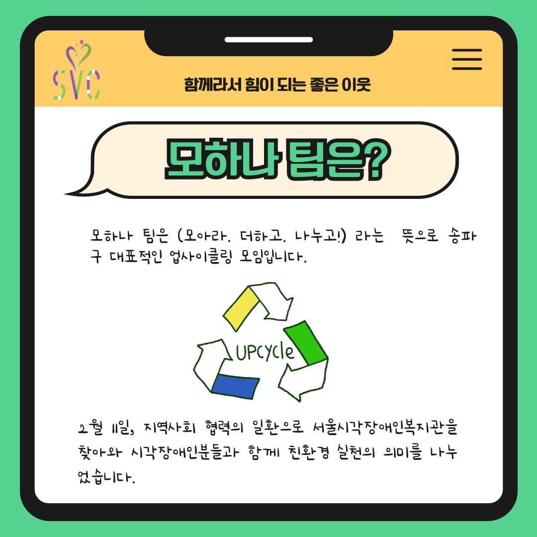 2월 11일, 지역사회 협력의 일환으로 송파구 업사이클링 모임 ‘모하나’ 팀이 서울시각장애인복지관을 찾아와 시각장애인분들과 함께 친환경 실천의 의미를 나누었습니다.