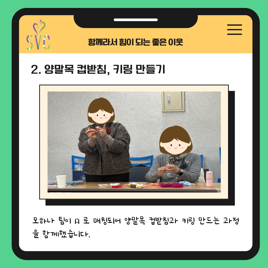 이후 모하나 팀과 1:1로 매칭되어 양말목 컵받침과 키링을 함께 만들며 소통하는 시간을 가졌습니다.