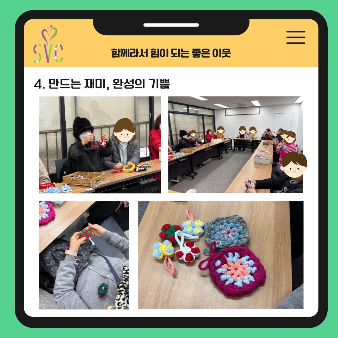 또한 직접 만든 양말목 컵받침과 꽃 브로치를 정성껏 준비해 참여자분들께 선물해 주셨습니다.