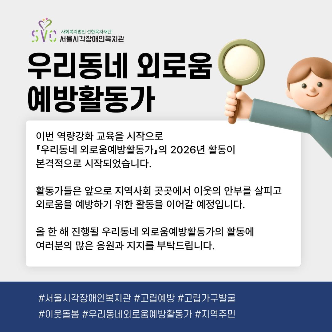 서울시각장애인복지관 또한 외로움 없는 따뜻한 지역사회를 만들어가기 위해 지속적으로 노력하겠습니다!