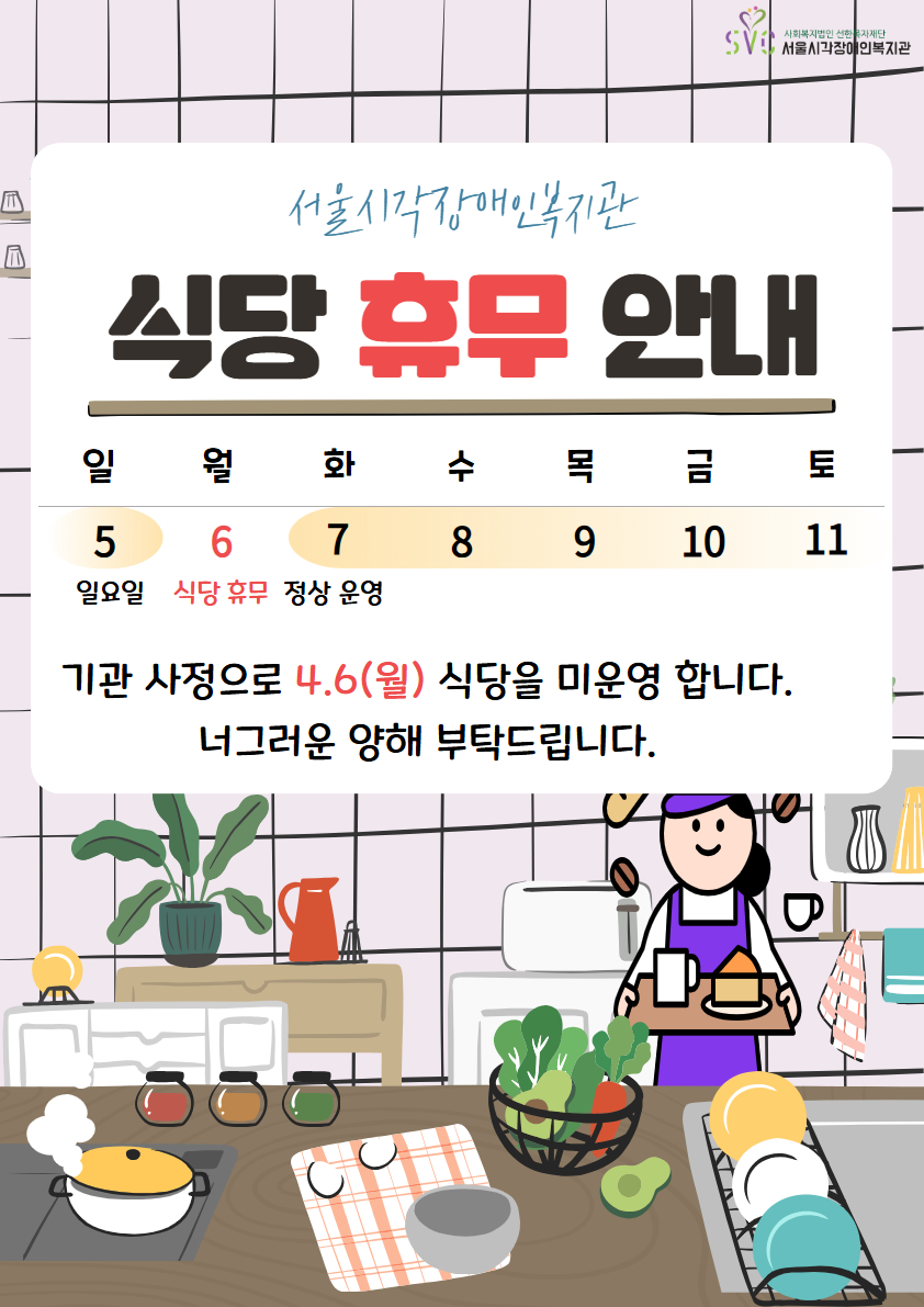 복지관소개 인사말 미션·비전 인재상 연혁 시설안내 조직도·직원소개 법인소개 사업안내 경영지원팀 기획전략팀 대체자료팀 사회참여팀 자립지원팀 이용안내 이용안내 상담신청 복지관 일정 프로그램안내 이주의 식단 실습안내 기관방문안내 열린의견함 후원·자원봉사 후원안내 자원봉사안내 나눔소식 알림공간 공지사항 서시복이야기 사서함이야기 채용공고 경영공시 언론홍보 발간자료 이달의 대체자료 직원게시판 공지사항 정보공유실 비상연락망 고충처리게시판 마이페이지 로그인 전체메뉴 알림공간 서울시각장애인복지관의 행복한 이야기를 전합니다. 알림공간 공지사항 서시복이야기 사서함이야기 채용공고 경영공시 언론홍보 발간자료 이달의 대체자료 Home 알림공간 공지사항 공지사항 경영공시 채용공고 발간자료 소식지 프로그램안내 사서함이야기 나눔소식 후원신청 후원보고 자원봉사모집 실습공지 기관방문신청 힣[인트라넷]공지사항 복지관 일정 이주의 식단 열린의견함 자주묻는질문 언론홍보 이달의 대체자료 동영상 힣[인트라넷]정보공유실 힣[인트라넷]비상연락망 힣[인트라넷]고충처리게시판 서시복이야기 공지사항 상담신청 자원봉사후기 식당 미운영 안내(4.6) 관리자 2026-04-06 조회 16 기관 사정으로 4월 6일(월) 식당을 미운영합니다.너그러운 양해 부탁드립니다. 썸네일 _26_ 4월 식당 미운영 안내 홍보문_min.jpg (대표) 목록